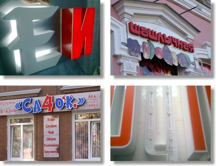 Для создания объёмных букв используется акриловое и орг. стекло, пластик ПВХ, жестяной профиль, а также виниловая плёнка.