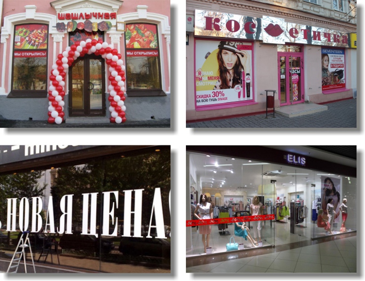 Витрины и окна (витражи), также являются рекламными площадями. И их грамотное использование может повысить посещаемость клиентов. Помимо размещения на витрине товара, её можно декорировать с помощью современных технологий. Тем самым создав ей более яркий и оригинальный вид. В витрине можно разместить рекламу нового товара, или информацию о проведении временных акций, или скидок (сезонная распродажа, -30%, -40% и т.д.).